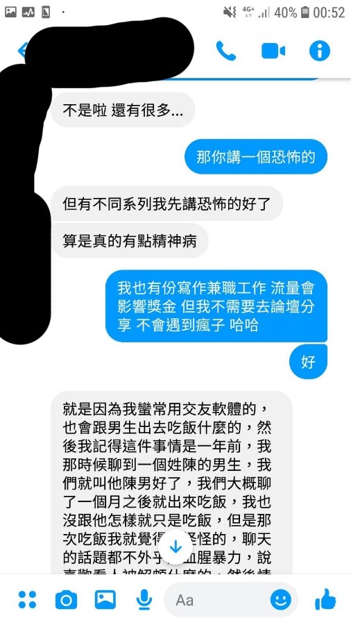 接著話題從一開始的她被騷擾的話題,走向她喜歡的恐怖靈異話題(圖2)。因為她是靈異社團認識的女生,所以很簡單就可以找到共同話題做「事件導向」的聊天。