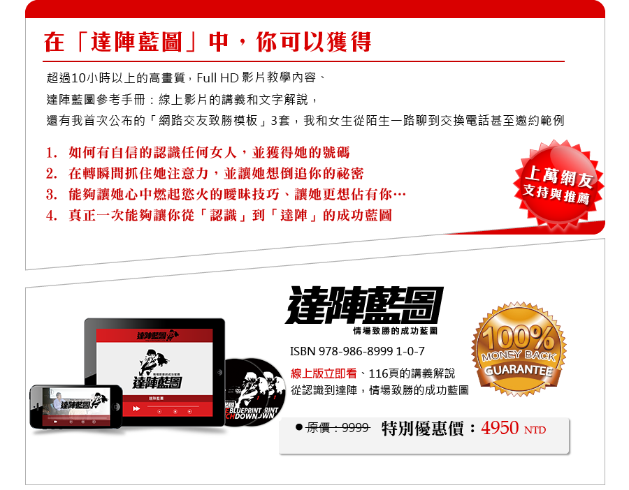 為什麼我敢這麼做?除了是因為我有自信「達陣藍圖」的內容一定能夠給你在情場上巨大的成功外,更是為了可以讓你毫無風險的放心享受優質的內容。
